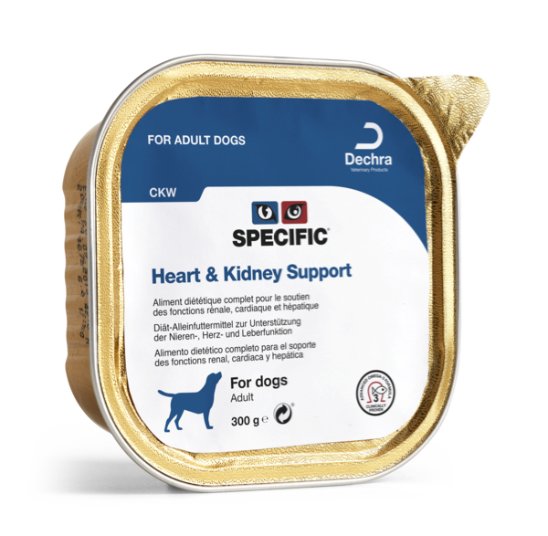 SPECIFIC™ CKW – Heart and Kidney support is a wet food designed to provide nutritional support for adult dogs with reduced heart, kidney and/or liver function and to help prevent the formation of calcium oxalate, urate or cysteine stones. High levels of Omega 3 from fish, reduced protein and carefully balanced vitamins and minerals support the blood pressure and reduce kidney workload.